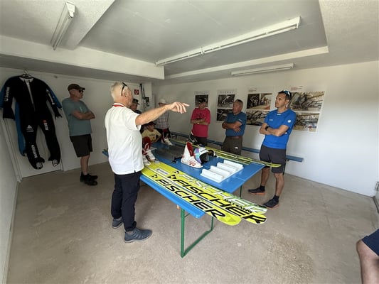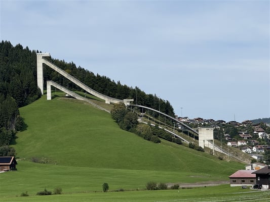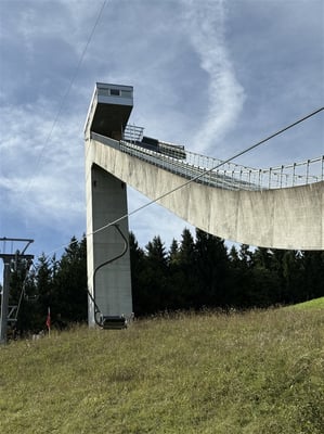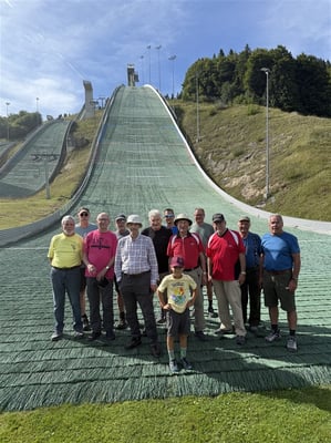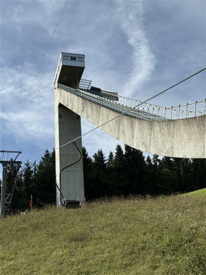 Dann, um 14 Uhr, kam die letzte Etappe, der Weg zu den Sprungschanzen. Obwohl eine Flachetappe, bekundeten einige doch Mühe, sodass wir etwas zu spät am Ziel eintrafen. Aber Herrmann, unser Führer, wartete und erklärte uns die komplexen Zusammenhänge im Skispringen. Überraschend war, dass die Anlagen in Einsiedeln nur für den Sommerbetrieb gebaut wurden.