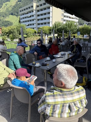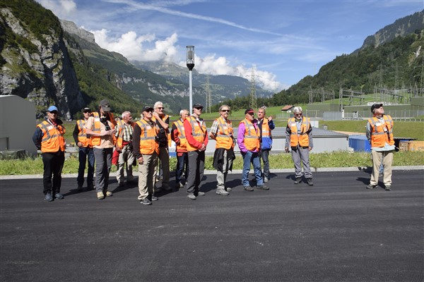 Vor der Führung konnten wir ein feines Mittagessen mit Glarner Cordonbleu, gefüllt mit Zigerkäse, geniessen. Mischgemüse und Pommes gehörten ebenso dazu wie als Vorspeise ein Salat nach Wahl. Das war für die meisten von uns mehr als genug. Danach kam der Höhepunkt des heutigen Tages, die Besichtigung des Linth-Limmern Wasser-Kraftwerkes, an die Reihe. Zwei erfahrene Führer erklärten uns das imposante Bauwerk, das erste seiner Art in der Schweiz, das dem Ausgleich der Stromkapazitäten im Schweizerischen Elektrizitätsnetz dient. AXPO betreibt dieses Pumpspeicherwerk. Zuerst fuhren wir 12 Min. mit einer Drahtseilbahn 700 Höhenmeter im Berg aufwärts. Nach kurzem Gehweg durch endlos riesige Kavernen, welche auch mit Fahrzeugen befahrbar sind, gelangten wir zu den Maschinenwerken des Kraftwerkes, dem Turbinenraum und im erdbebensicheren Abstand von 70m dazu zum Transformatoren-Raum. Vor einer Ersatzturbine im Wert von CHF 5 Mio. machten wir ein Gruppenfoto. Nach 2h Führung fuhren wir wiederum mit der Standseilbahn zurück nach Tierfehd und 2 Kleinbusse brachten uns zur Talstation der Braunwaldbahn nach Linthal. In Braunwald angekommen führte uns ein halbstündiger, schweisstreibender Aufstieg zum Hotel Tödiblick, welches mit herrlichem Ausblick auf die Glarner Alpenwelt empfing. Dort konnten wir unsere 2er-Zimmer beziehen und einen feinen Apéro vor dem Abendessen geniessen. Es gab eine weitere Glarner Spezialität: Chalberwurst mit Kartoffelstock und feinem warmem Zwetschenkompott – das typische Glarner Landsgemeindeessen - und allerlei für den Durst sowie einen Kaffee "avec" zur Abrundung danach. Ende des ersten Ausflugtages.