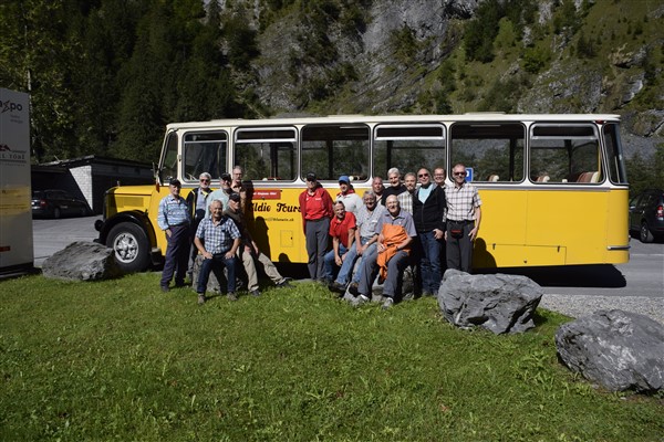Die diesjährige MR Turnfahrt führte uns ins Glarnerland. Nach der Begrüssung der 17 Teilnehmer wurden wir mit einem Champagner-Apéro beim Güterschuppen am Bahnhof Horgen überrascht. Noch mehr erstaunt waren wird durch das auf uns wartende Saurer-Oldtimer Postauto, mit Fahrer in Originaluniform, welches uns nach Linthal-Tierfehd zur Besichtigung des Linth-Limmern Wasserkraftwerkes führen sollte. Vielen Dank Peter für dein grosszügiges Geburtstagsgeschenk an die Männerriege!