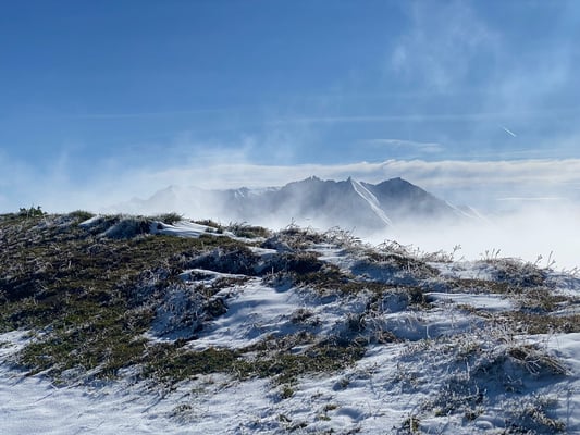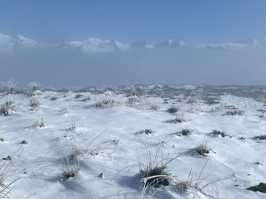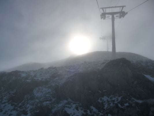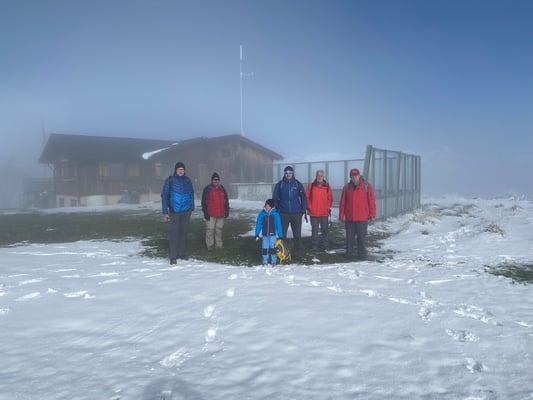 Nebelschwaden. Erste Berührungen mit Schnee gebo-ten zum Aufwärmen in der Gipfelhütte auf den bewährten Kafi Luz zurückzugreifen.