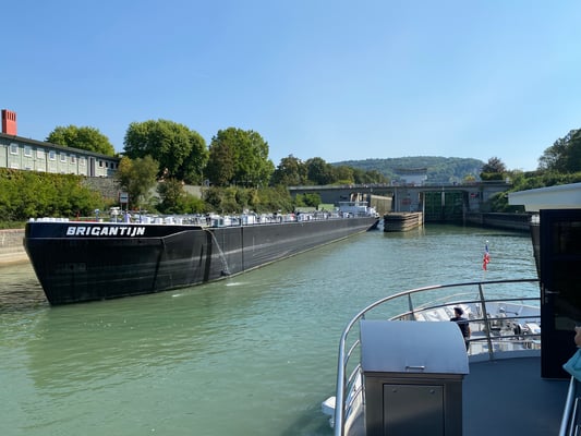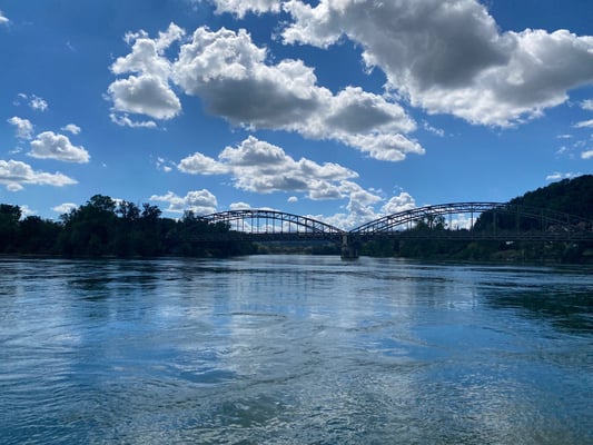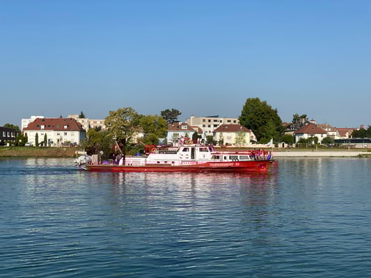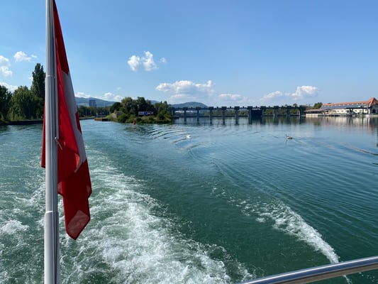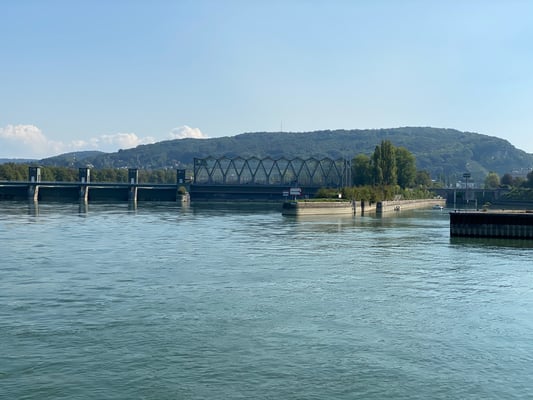 Unsere Schifffahrt führte uns entlang des Hafens, der Basler Stadtkulisse, und den sehr imposanten zwei Roche-Türmen, den momentan höchsten Gebäuden der Schweiz, den tollen Landschaften, Weinbergen und Dörfern. Ganz speziell beeindruckten die Passagen der zwei imposanten Schleusen bei den Flusskraftwerken Birsfelden und Augst, wo wir jeweils mehrere Meter hochgehievt wurden. Auch konnten wir auf dem Schiff ein feines Mittagessen geniessen: Piccata Milanese, schön garniert, und unser Durst konnte ebenfalls gelöscht werden.