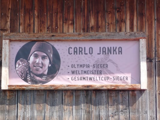Nach diesem Abstecher in den Schnee, wanderten wir über die herbstlichen Alp-weiden zum Mittagshalt zu Ursula Janka ins Restaurant Stai. In der Gaststube ausgestellt sahen wir zum ersten Mal die vielen Pokale, welche Sohn Carlo im Laufe seiner Karriere angesammelt hatte – auch den für den Gesamtweltcup 2009/10 – so wie sie in Wirklichkeit aussehen.