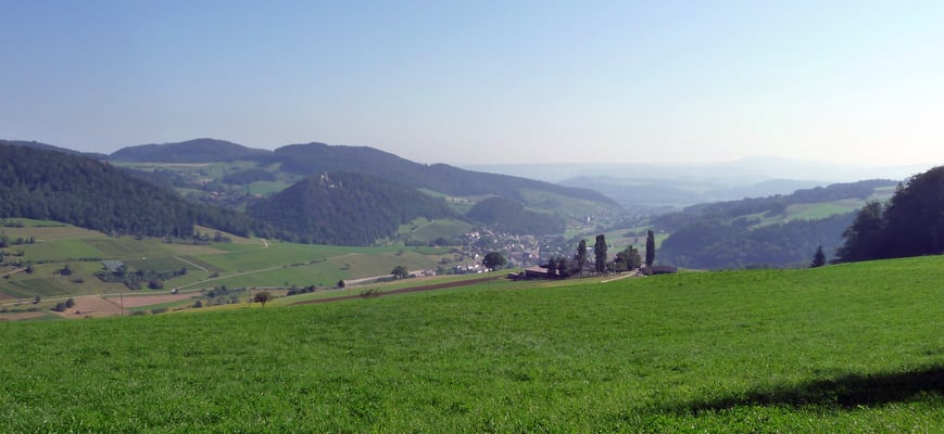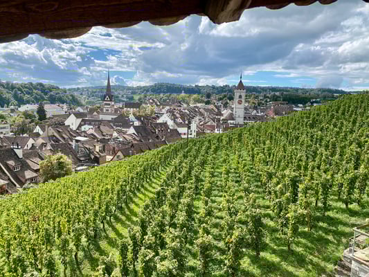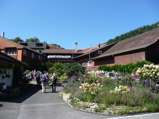 Ab der Juraweid war es noch gut eine Stunde bis ans Tagesziel, das Hotel Traube in Küttigen. Geduscht, erfrischt und umgezogen trafen wir uns vor dem Hotel im Garten zum nächsten, diesmal sehr entspannten Apéro. Vor allem der örtliche Weisswein aus blauen Burgundertrauben war sensationell gut, zusammen mit frischgebackenem Speckzopf zum Dahinschmelzen.