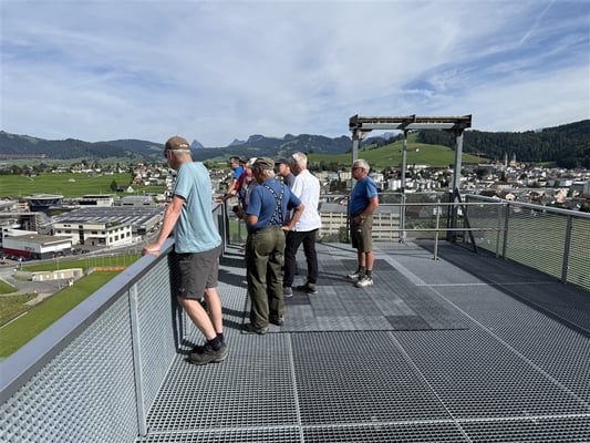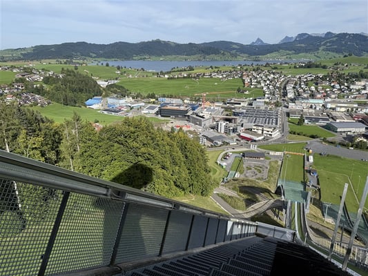 Nach der Besichtigung des Sprungrichterturms brachte uns der kleine Sessellift zur grossen Schanze und deren prachtvollen Aussicht über Sihlsee, Einsiedeln, das Alpthal, die Mythen und die Rotenflue, unseren Höhepunkt vom Vortag.
