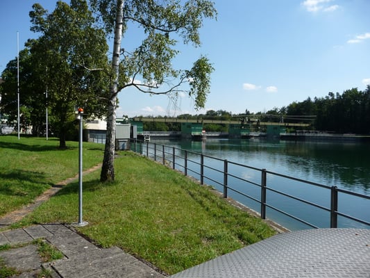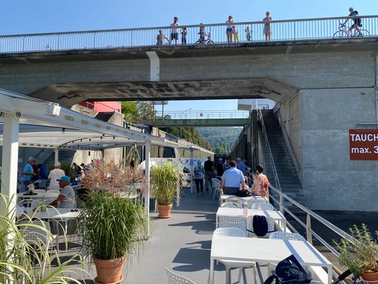 Die restlichen 12 Wandergesellen wanderten weiterhin auf deutscher Seite des Rheins bis zum imposanten, deutsch-schweizerischen Flusskraftwerk Ryburg-Schwörstadt bei Möhlin, auch hier mit sehr grosszügigen Fischaufstiegsgewässer-Anlagen. Über die erst 2014 erbaute Fuss- und Radwegbrücke kehrten wir zurück in die Schweiz. Ein gemütlicher Bachweg führte uns zum Bahnhof Möhlin, wo wir uns nach dem schweisstreibenden 1 ¾-stündigen Marsch im gleichen Restaurant wie am Samstag auf das wohlverdiente Bier freuten. Ein herzliches Dankeschön an Hanspeter für die offerierte Runde. Sogar für ein Gruppenfoto hatten wir noch Zeit, bevor wir uns auf unsere Heimfahrt via Basel SBB begeben mussten. In Zürich HB verabschiedeten wir uns noch von Marcel, der Richtung Appenzell weiterfuhr.