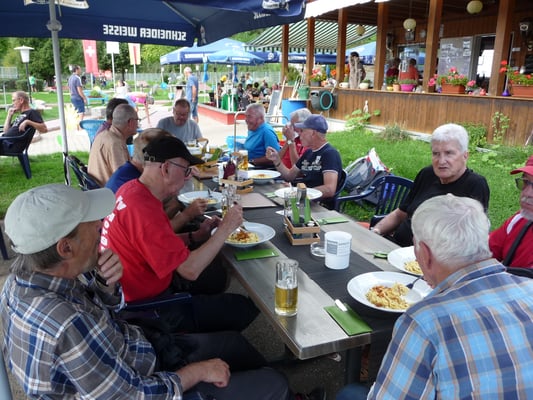 Trotz allem, oder gerade weil keine Hektik aufgekommen war und immer genügend Zeit zur Verfügung stand, waren alle bei bester Laune. So genossen wir auch noch den traditionell letzten Fixpunkt einer Turnfahrt: den von der Gehrenkasse gesponserten Wurst/Käsesalat, diesmal in Trübbach, kurz vor Sargans.