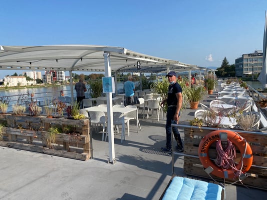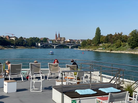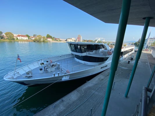 Um 10.15 Uhr war das gediegene Ausflugsschiff RHYSTÄRN startbereit und wir freuten uns auf eine tolle Rhein-Schleusenfahrt nach Rheinfelden. Da die anderen Passagiere erst an der Station Schifflände in Basel zusteigen konnten, war es uns möglich auf dem Aussichtsdeck die besten Plätze einzunehmen und als erste Getränke bestellen und geniessen zu können. „Pries än Schnupf“ hiess es ein erstes aber nicht ein letztes Mal, gäll Charly!