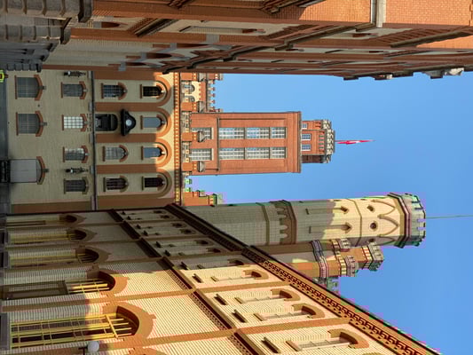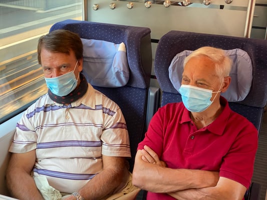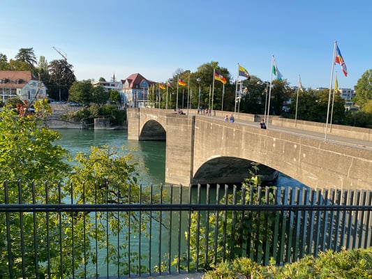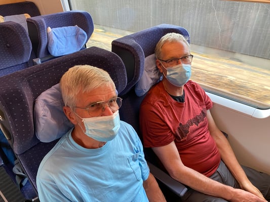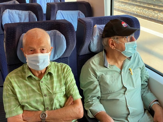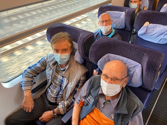 Bei Sonnenaufgang trafen wir uns frühmorgens am Bahnhof Horgen. Herrliches Wetter mit blauem Himmel erwartete uns. Ab Zürich HB fuhren wir im brandneuen IC der DB in knapp einer Stunde nach Basel HB und per 8i -Tram via Barfüsserplatz und dem roten Basler Rathaus zur Station Basel- Kleinhüningen. Ein viertelstündiger Fussmarsch führte uns dann zum bekannten Dreiländereck mit seinem prägnanten, dreiflügeligen und raketenähnlichen Denkmal für den geografischen Grenzpunkt von CH-F-D. Wegen Corona fand der OK-Begrüssungstrunk von Bruno und Marcel erst hier statt und nicht wie bisher üblich während der Zugsfahrt.