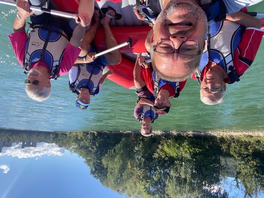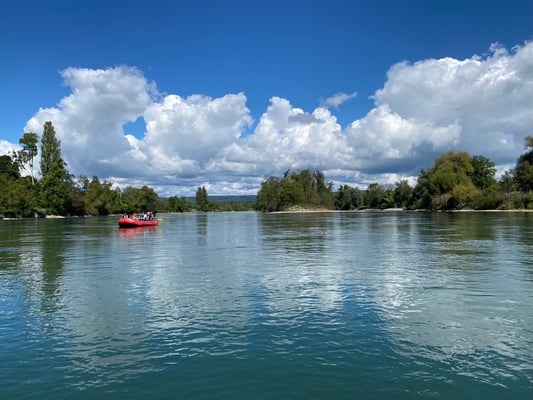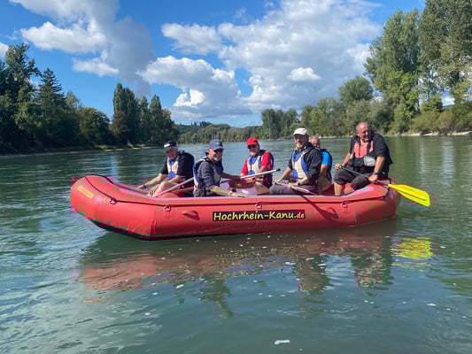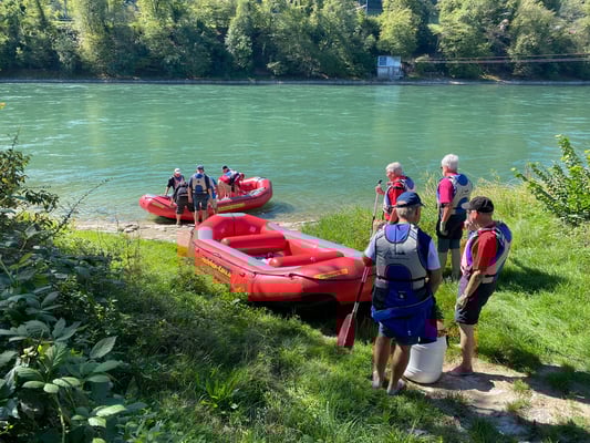 Nach einem herzhaften Frühstück im Hotel verliessen wir Lottstetten wieder und fuhren mit dem Zug nach Eglisau und nach einem Kaffeehalt weiter nach Rekingen AG. Wir überquerten die Grenze via Kraftwerk Reckingen und marschierten ein kurzes Stück flussabwärts. Dort erwartete uns bereits Beat Stäheli mit einem Guide für Flussfahrten. Es gab eine kurze Instruktion und danach zogen wir Schwimmwesten an und hoben die beiden Rafts in den Rhein. Peter Horlacher übernahm die Leitung des einen Bootes, während der Guide im anderen Boot Platz nahm. Nach ersten Paddelversuchen spielten sich die beiden Teams gut ein und es ging rheinabwärts, mal in D, mal in CH, über Zurzach CH/Rheinheim DE bis Koblenz CH/Waldshut DE, vorbei an der Wutachmündung DE und der Aaremündung CH. Meistens konnten wir uns treiben lassen und die herrliche Aussicht geniessen. Ab und zu waren ein paar Paddelschläge notwendig, um die Boote an der richtigen Stelle im Rhein durchzuloten. Ohne grosse Probleme kamen wir dann in Waldshut an und hoben unsere Rafts aus dem Wasser. Nachdem wir sie aufgeladen hatten und die Wanderschuhe wieder an den Füssen waren, ging es zu Fuss weiter zu einem Minigolfplatz mit Restaurant. Das Mittagessen dort bestand für die meisten aus Kässpätzle und Bier. Die nächste Etappe führte uns vom Bahnhof Waldshut via Döttingen nach Endingen. Dort besuchten wir das «Dreifach-Museum für Landwirtschaft, Handwerk und Feuerwehr», eine riesige Ansammlung von historischen Stücken. Unter anderem steht dort ein Feuerwehrfahrzeug, welches aus Horgen kommt. Natürlich durfte auch der traditionelle Wurstsalat nicht fehlen, welchen wir direkt vor Ort einnehmen konnten. Satt und müde kehrten wir dann via Baden und Zürich wieder zurück nach Horgen. Herzlichen Dank an Beat Stäheli und Peter Stünzi für diese wirklich abwechslungsreiche Tour. Ein weiterer Dank geht an alle Apéro und sonstigen Sponsoren. Wir freuen uns auf nächstes Jahr!