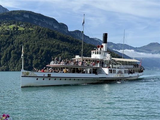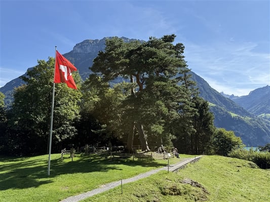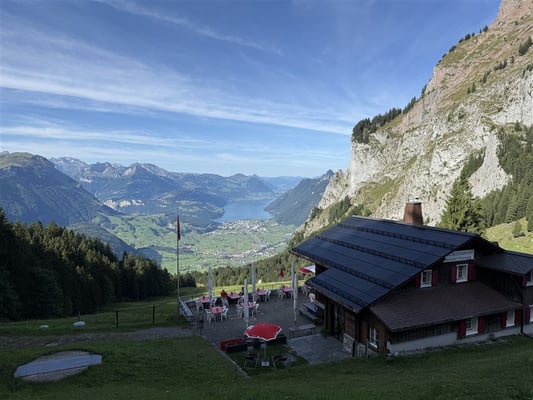 Nach getaner Arbeit überquerten wir den See zur Rütliwiese und, noch wichtiger, zum dortigen Restaurant. Nach einem ausgiebigen Mittagessen, mit oder ohne Dessert, ging es weiter, nochmals per Schiff und S-Bahn über Flüelen und Schwyz zur neuen Rotenfluebahn. Mit immer grösser werdender Rundsicht schwebten wir fast 1000 Höhenmeter zum höchsten Punkt unserer Reise, der Rotenflue, auf 1571 Meter.