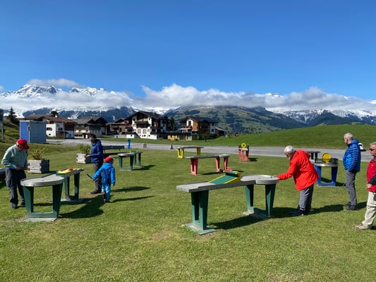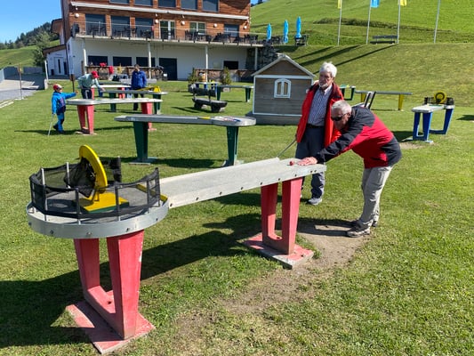 Inzwischen hatten sich alle Wolken verzogen, sodass bis zur Abfahrt des Postautos noch Zeit blieb für eine weitere Premiere: Eine Runde PitPat im Rufali-Spielpark. Das ist Minigolf auf Tischen, gespielt mit kleinen Billiard – Stöckchen. Eine Gaudi,