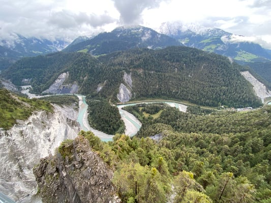 Gewässern lag zuerst der spektakuläre Aussichtspunkt „Il Spir“, am Abbruchrand der Ruinaulta, 375 Meter über dem frei und wild dahinfliessenden Vorderrhein. Als zweite Station kam das Restaurant