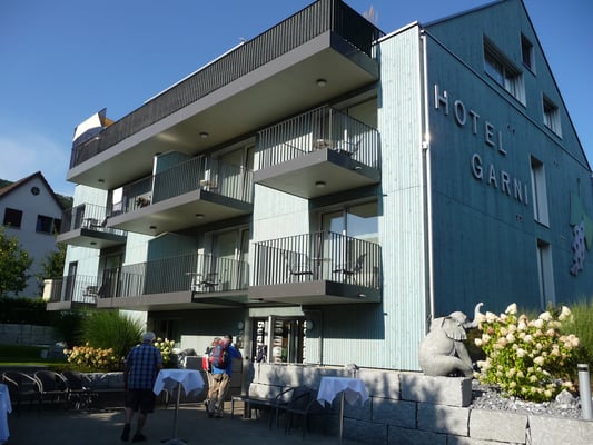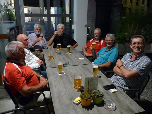 Um ca. 17 Uhr hiess es: Weiter geht’s - und wir machten uns auf zum Bahnhof Möhlin und das gegenüberliegende Restaurant. Nach dem von Bruno offerierten Stärkungstrunk fuhren wir per S1-Bahn zurück nach Rheinfelden, um dort über den Rhein die Grenze nach Deutschland zu überqueren. Bald erreichten wir unser Hotel Garni Oberrhein. Nach Bezug unserer Zimmer wurden wir vom Hotelier mit einer Runde Getränke nach Wahl und dazu feinem Apérogebäck und dekorierten Wurstbeilagen verwöhnt. Dies noch vor dem Abendessen!