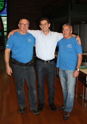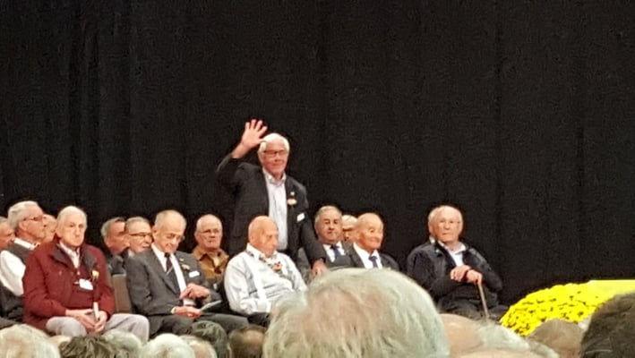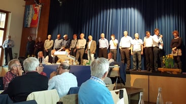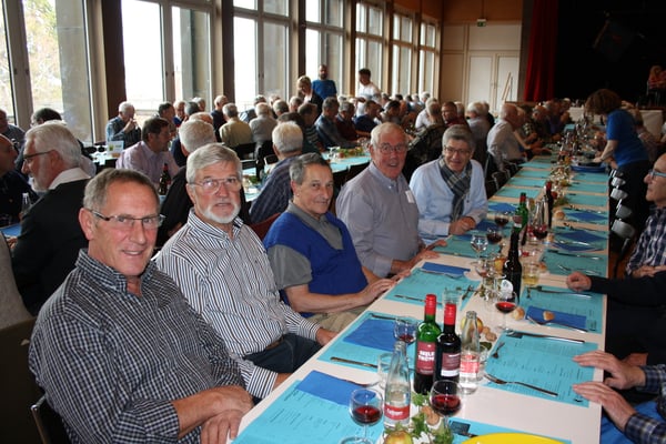 Nach dem Frühstück machten wir uns zu Fuss auf den Weg zum Gemeindesaal Sankt-Leonhard, wo die Tagung stattfand. Nach einem Kaffee (Gipfeli waren schon weg ☹) begann die Versammlung, Punkt 10:00. Rund 670 Teilnehmer hatten sich eingefunden, wobei unser Verband mit 99 Veteranen die grösste Gruppe stellte. Hugo Landolt durfte gleich auf der Bühne Platz nehmen. Er erhielt das goldene Abzeichen, welches man mit 80 Jahren und mindesten 5 Teilnahmen an einem „Eidgenössischen“ bekommt. Daneben wurden die gewohnten Traktanden abgearbeitet und wie üblich das eine oder andere Lied gesungen. Um 12:00 war dann Apéro-Zeit. Das Mittagessen wurde um 13:00 serviert, gar nicht so einfach für so viele Leute. Trotzdem hat alles bestens geklappt und nach Kaffee und Dessert machten wir uns mit vollen Bäuchen auf den Rückweg.