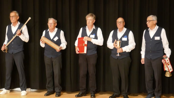 Am anderen Morgen genossen je nach Bedürfnis die einen mehr und die anderen weniger das Frühstücksangebot des Hotels, bevor uns die bereit gestellten Cars an den nahegelegenen Tagungsort Willisau brachten. Schnell fanden wir die für uns reservierten Plätze in der grossen, für rund 600 eidgenössische Turnveteraninnen und Turnveteranen aus der ganzen Schweiz eingerichteten Festhalle. Musikalisch eingestimmt auf die 128. ETVV-Tagung wurden die Versammlungsteilnehmer durch die Veteranen Musik Willisau. Um 10.00 Uhr marschierte der Zentralvorstand mit der Fahne ein, was den eigentlichen Tagungsbeginn markierte. Darauf wurden traditionsgemäss die Nationalhymne und das Turnerlied angestimmt. Es folgten die Grussbotschaften des Zentralpräsidenten Erwin Flury und der OK-Präsidentin Hildegard Meier, worauf Ständerat Damien Müller das Gesagte jeweils in französischer Sprache zusammenfasste. Auf die Ehrung der Verstorbenen und die Grussbotschaft des Luzerner Regierungsrates Fabian Peter folgte die Berichterstattung durch den Zentralpräsidenten über die Beschlüsse der Delegiertenversammlung vom 22.08.2025 in Romanshorn. Connie Gamma überbrachte die Grüsse aus dem Zentralvorstand des STV und informierte über Neuigkeiten im Verband. Der erste Höhepunkt war dann die feierliche Ehrung der 80jährigen sowie der 90jährigen und älteren anwesenden Turnkameraden. Der älteste teilnehmende Veteran war 100jährig! Die 80jährigen Veteranen erhielten alle das goldene Treueabzeichen und wurden unter Beifall ihrer Gruppenkameraden namentlich aufgerufen. Diese Ehre wurde auch sechs Turnveteranen aus der Gruppe Zürichsee-Oberland zu teil, darunter auch unserem Turnkamerad Sepp Jud, der früher beim TV Horgen turnte. Ein besonderer Akt an jeder Landsgemeinde ist die Insignien-Übergabe. Banner, Säbel, Satzungen, Herdenbuch, Becher und Glocke wechseln in einer genau reglementierten Zeremonie vom Organisationskomitee der letzten Tagung an das neue OK. Nach diesem traditionellen Akt erfolgten weitere Grussbotschaften aus Politik, Mitteilungen des OK und das Schlusswort des Zentralpräsidenten. Beendet wurde die Versammlung wie jedes Jahr mit dem gemeinsam gesungenen Lied „Là haut, sur la montagne …“. Der anschliessende Apéro vor der Festhalle bot Gelegenheit für letzte Gespräche mit Kameraden anderer Gruppen. Das Bankett bestand aus Blattsalat Mimosa, Rindsgeschnetzeltem Stroganoff mit Knöpfli und zweifarbigen Rüebli. Als Dessert gabs Willisauer-Ringli-Parfait, eine örtliche Spezialität. Um ca. 15.30 Uhr trat die Gruppe Zürichsee-Oberland die Heimfahrt an. Die Mehrheit der Horgner Veteranengruppe schloss den diesjährigen Landsgemeindebesuch mit einem letzten Umtrunk im The Yarn ab, bevor man sich müde, aber zufrieden auf den Heimweg begab.