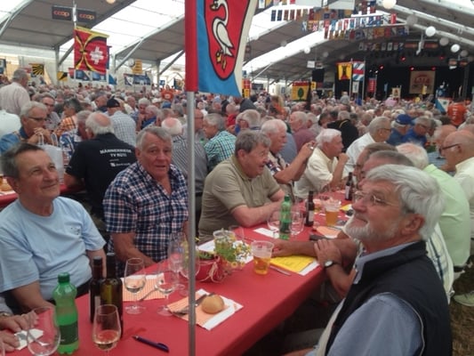 Am Bahnhof Rikon wurden wir freundlich empfangen und ein kurzer Gehweg führte uns zum Festgelände. In der hintersten Reihe im Zelt, gerade beim Eingang, war für Horgen Platz reserviert. Für die nächste GV wird unser Platz turnusgemäss dann zuvorderst beim Rednerpult sein.