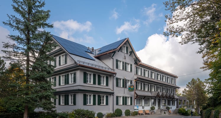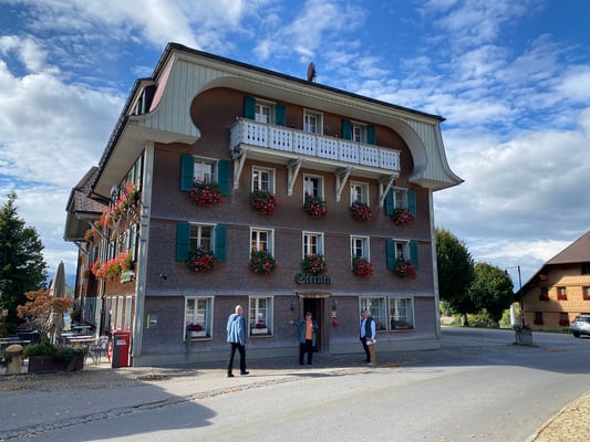 Nun waren alle gespannt, wo der nächste Halt sein würde, denn Reisemarschall Henry Hotz hatte dieses Jahr ein Geheimnis daraus gemacht, welche Lokalität er für das Mittagessen reserviert hatte. Nach rund eineinhalb Stunden Fahrt war die Frage geklärt. Die Busse hielten vor dem schönen Landgasthof Menzberg. Menzberg liegt im Luzerner Hinterland und ist mit 1016 m ü. M. das höchste Dorf im Napfgebiet. Der Landgasthof war früher ein Kurhaus. Mit seiner Errichtung im Jahr 1834 wurde das 600-Seelen-Dorf ein florierender Molken- und Luftkurort. Von Menzberg aus führt eine beliebte Rundwanderung über aussichtsreiche Höhenwege bis zum Gipfel des Napfs.